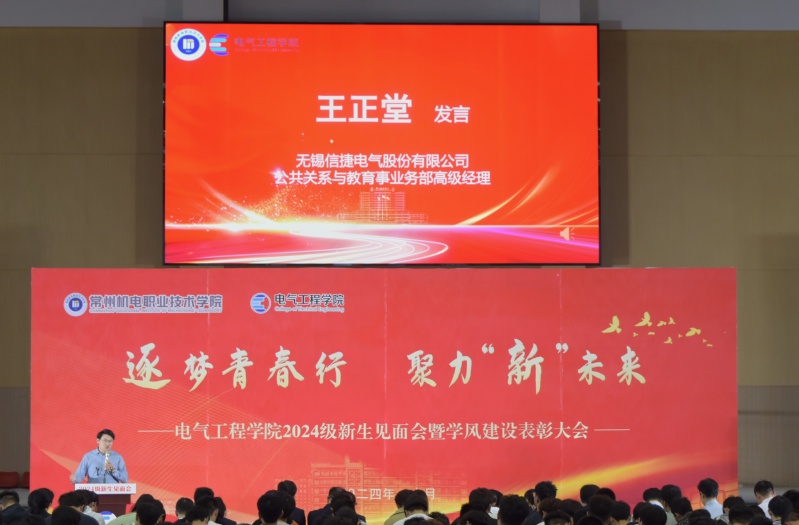 无锡信捷电气股份有限公司经理王正堂作为校企合作代表发言。他鼓励大学生珍惜大学时光全面发展,明确职业规划为未来准备,并关注社会发展,勇于担当。