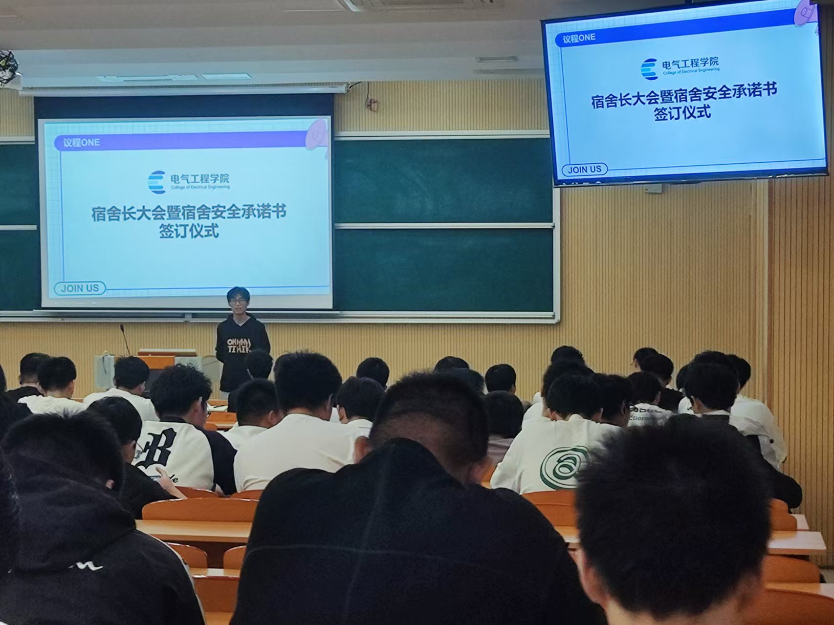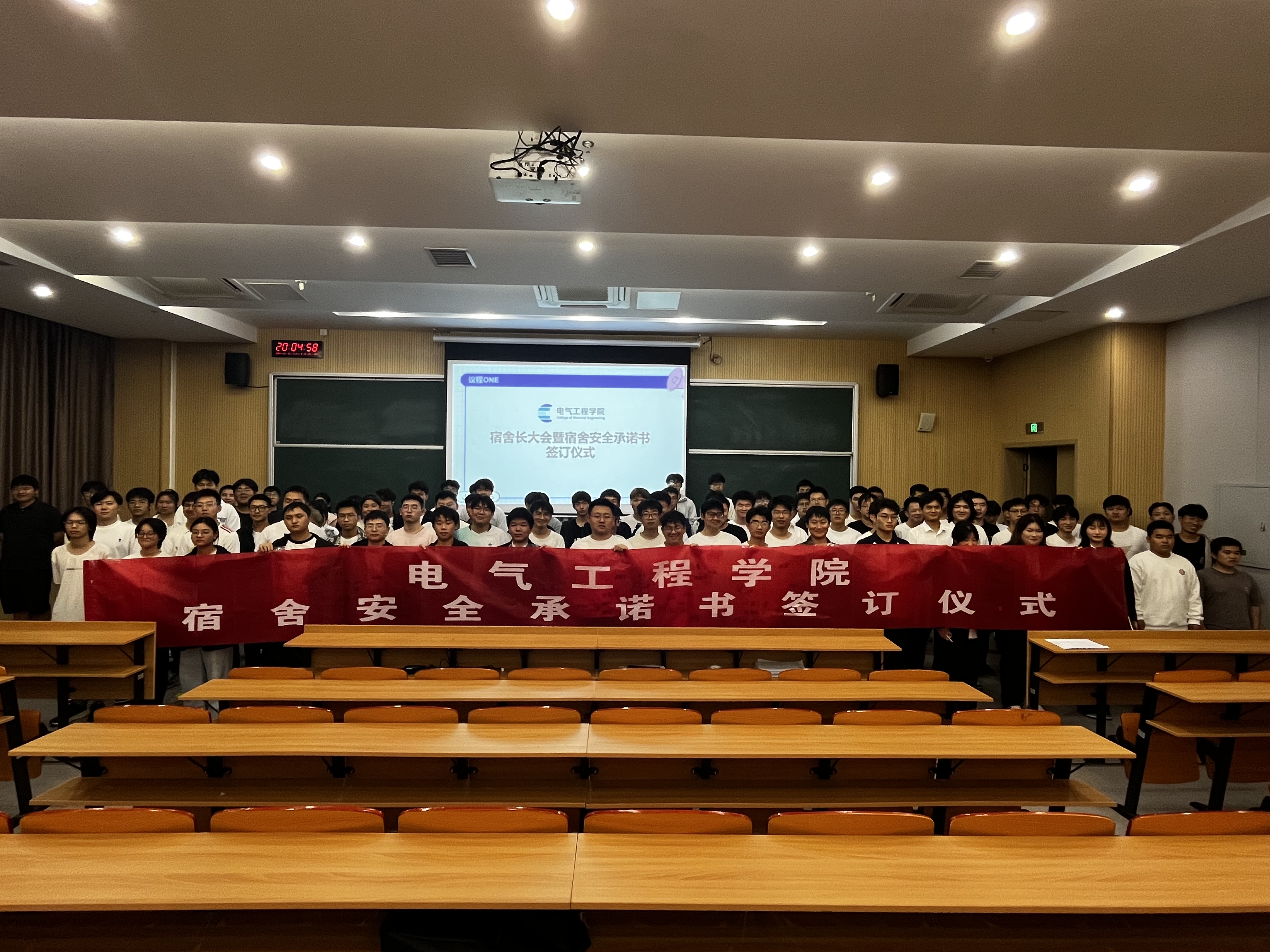 10月15日晚,为加强学生宿舍安全管理,增强学生的安全意识,电气工程学院在溧阳基地举行宿舍长大会暨宿舍安全承诺书签订仪式。公寓辅导员许向东及全体宿舍长、自律会代表成员参与,活动由自律会主席陈星雨主持。