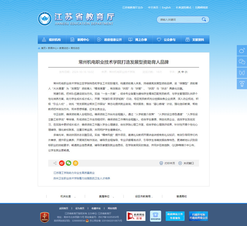常州机电职业技术学院立足学院特色和学生工作实际情况,构建资助育人体系,持续擦亮发展型资助品牌,变“保障型”资助育人“大水漫灌”为“发展型”资助育人“精准滴灌”,有效推动“扶困”与“扶智”、“扶困”与“扶志”具象化交融。