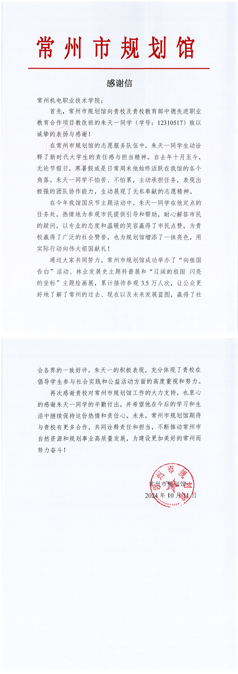 机制2338班的朱天一同学就是一个鲜活的典型。该同学在常州市规划馆的志愿服务队伍中,生动诠释了新时代大学生的责任感与担当精神,表现优异,收到了来自常州市规划馆的感谢信。自去年十月至今,朱天一同学无论节假日、寒暑假还是日常周末,都始终活跃在常州市规划馆的各个角落。他不怕苦、不怕累,主动承担任务,展现出极强的团队协作能力和无私奉献的志愿精神。