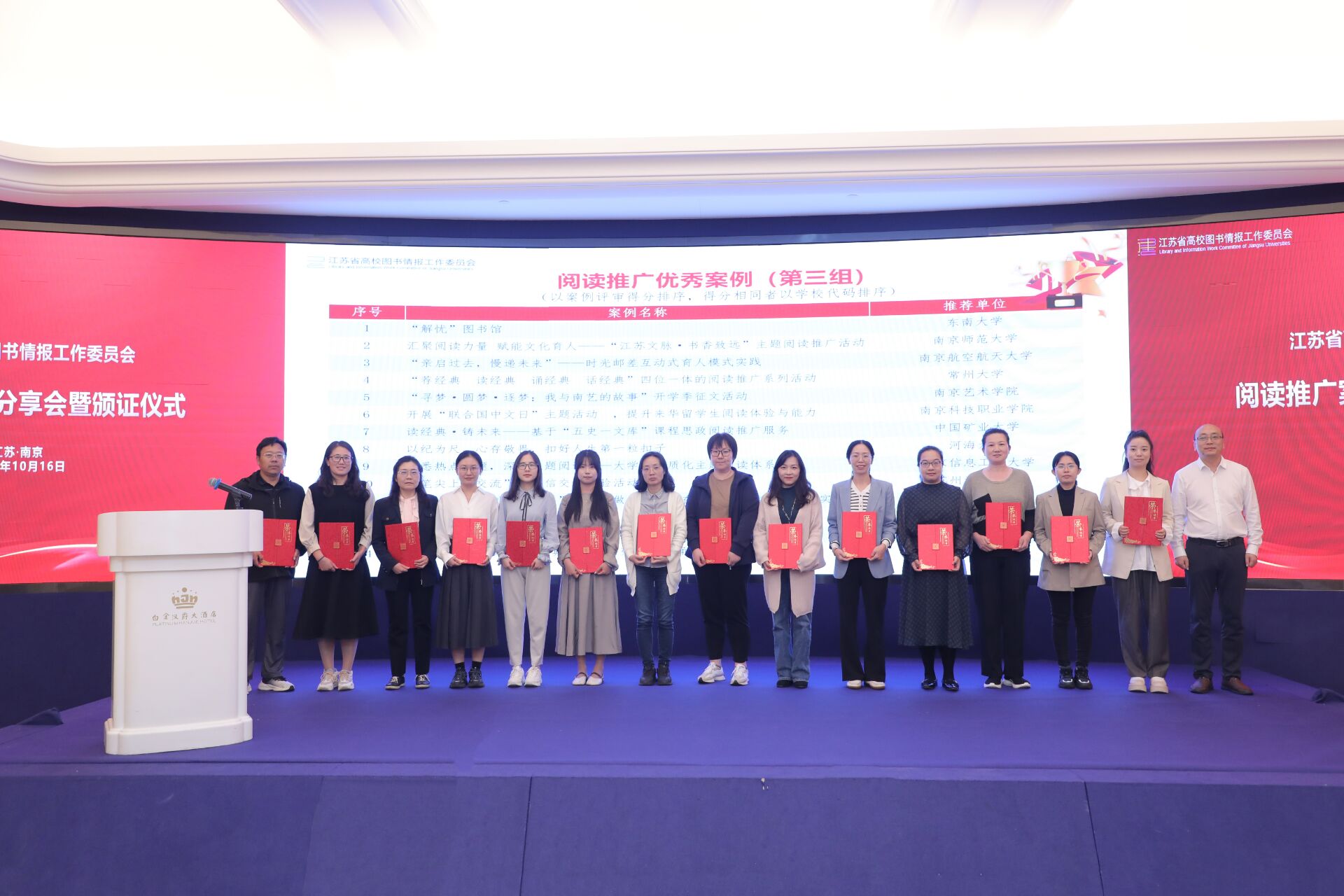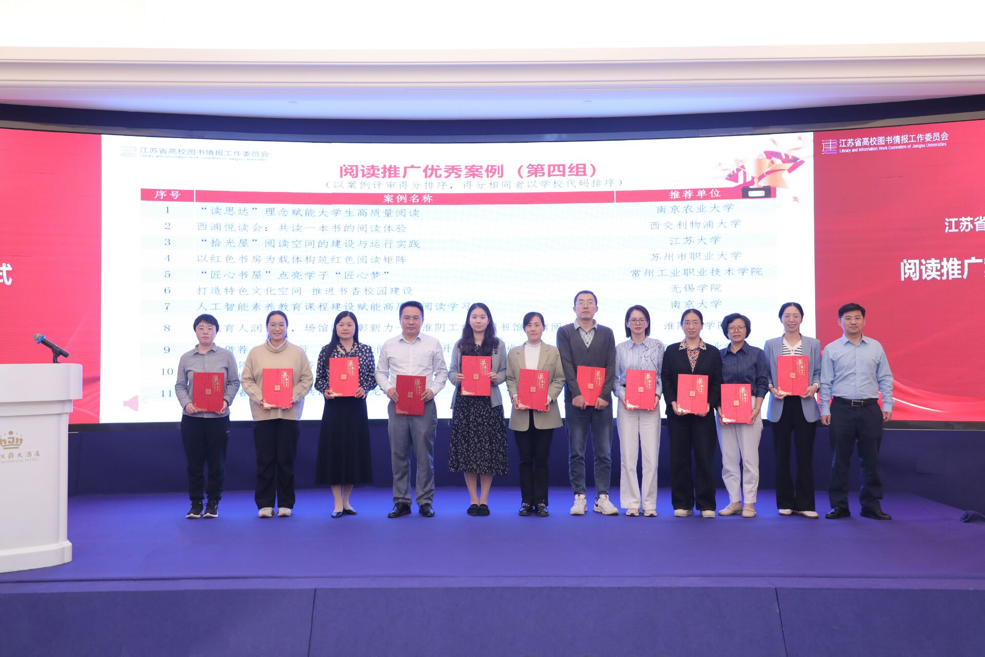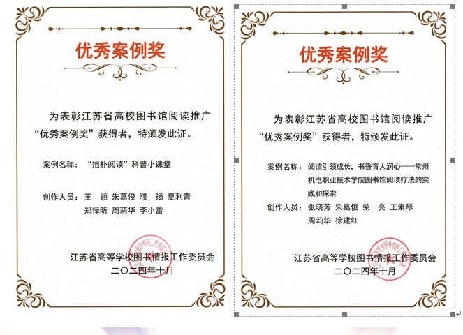 10月16日,江苏省高校阅读推广优秀案例分享会暨颁奖仪式在南京召开。大会表彰了62项江苏省高校图书馆阅读推广优秀案例,由我校图书馆报送的两个案例获奖。