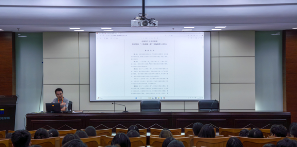学院团委书记吴小磊根据上级的文件精神,向同学们详细解读了《常州机电职业技术学院共青团推优入党工作实施细则(修订)》,从推优对象与基本条件、入党积极分子培养、工作要求等方面进行了阐述,为志愿加入中国共产党的团员青年指明了方向。他还向同学们重点讲解了《中国共产主义青年团基层组织“三会两制一课”实施细则》从支部大会、支部委员会、团小组会的组织架构,到团员教育评议制度、团员年度团籍注册制度的实施,再到团课的精心安排都一一进行了介绍,进一步加深了同学们对团的组织生活的认识与了解。