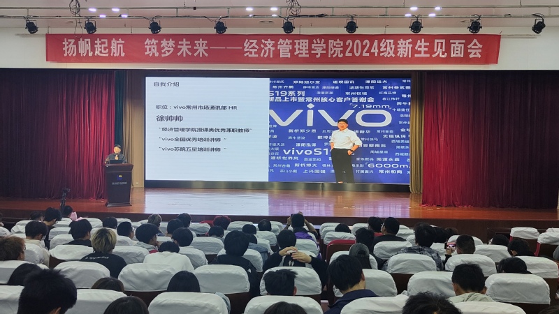 经济管理学院优秀校友、vivo手机常州地区运营总监徐帅帅作题为《厚德崇商 筑梦未来》的主题讲座。他为同学们分析了经济管理学院每个专业特色和未来发展方向。他引用耶鲁大学的图像旋转测试,现场测试了在场同学的性格特征和能力优势,建议同学们在校期间有针对性地提升综合素养和专项能力,为今后的就业工作和服务社会奠定良好基础。他分享了自己的成长经历,从一名“经管学长”的视角,激励全体同学以梦为马,不负韶华,风雨兼程,勇往直前。