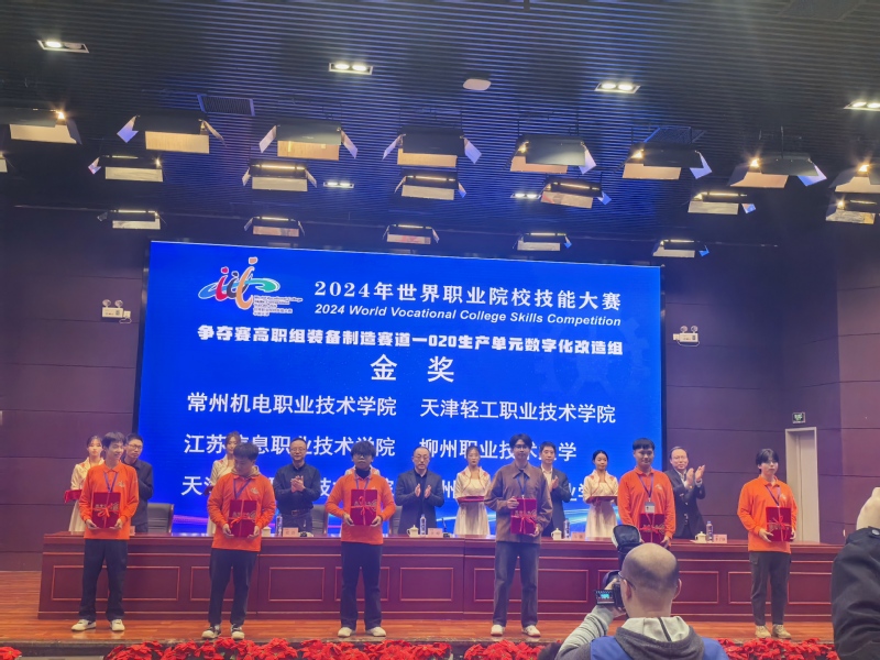 10月28日-10月31日,2024年世界职业院校技能大赛高职装备制造赛道-生产单元数字化改造项目决赛在天津轻工职业技术学院举办。本次比赛共有来自全国各地的60支队伍参加。我校电气工程学院学生王檐、曹明坤、徐春钰(指导老师:周斌、王斌)经过激烈角逐,斩获金奖。