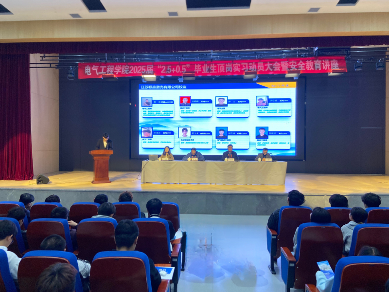 11月6日,电气工程学院在溧阳基地报告厅举办2025届“2.5+0.5”毕业生顶岗实习动员大会暨安全教育讲座。学院党总支副书记李兵、综合办/学工办主任翟新美、毕业班班主任、2025届“2.5+0.5”全体毕业生参加会议。