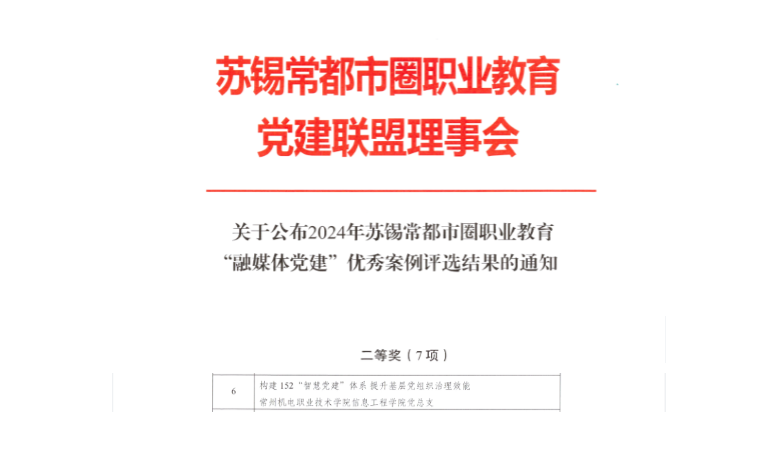 日前,苏锡常都市圈职业教育党建联盟理事会公布了2024年“融媒体党建”优秀案例评选结果,我校信息工程学院党总支的《构建152“智慧体系” 提升基层党组织治理效能》获二等奖。