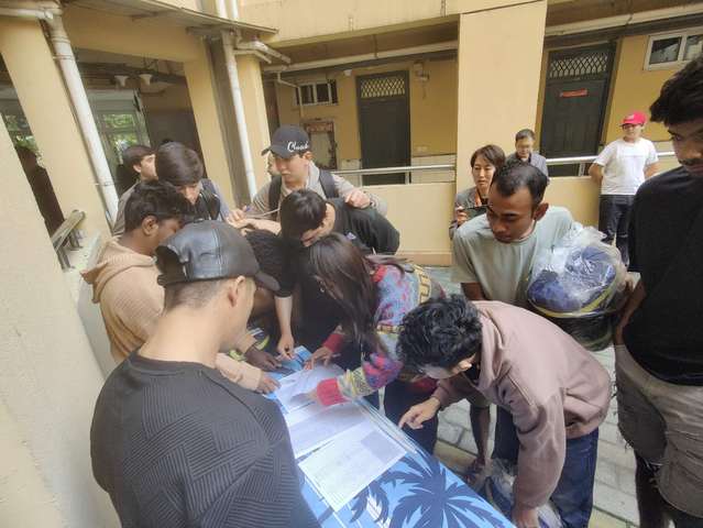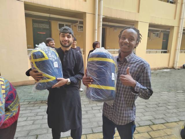 留学生班主任、国际教育学院教职工和志愿者们耐心地为留学生们分发睡袋,并细心提醒大家领取后注意晾晒。