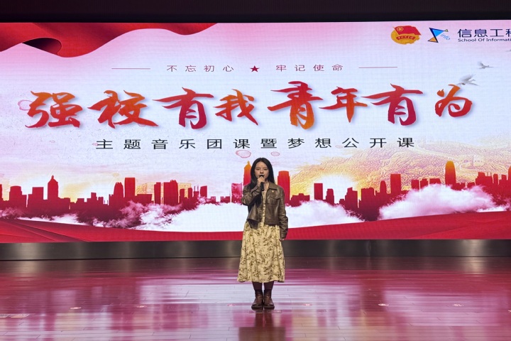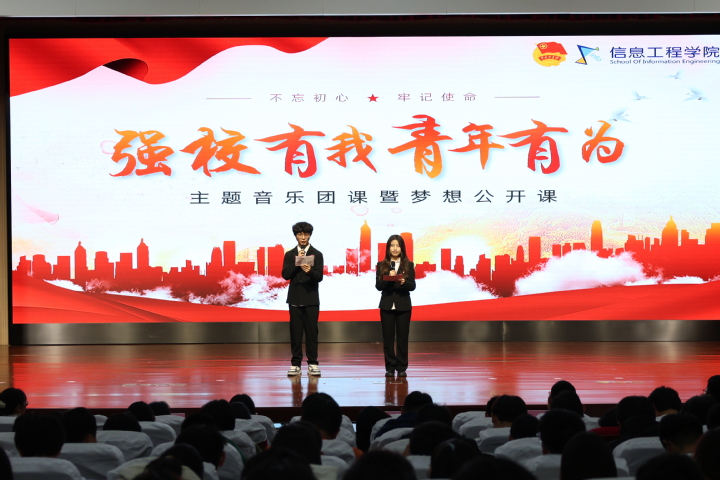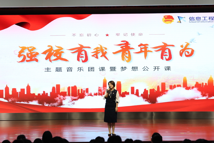 为庆祝新中国成立75周年,引领团员青年展现新时代青年新风貌,11月13日下午,信息工程学院在图书馆红厅开展“强校有我 青年有为”主题音乐团课暨梦想公开课。信息工程学院党总支副书记李丹屏,组织员薛军,团委书记秦希云,专职辅导员蒋云娟、刘飞、梁影、冒晨香和500多名团干部代表、团员代表参加本次团课。