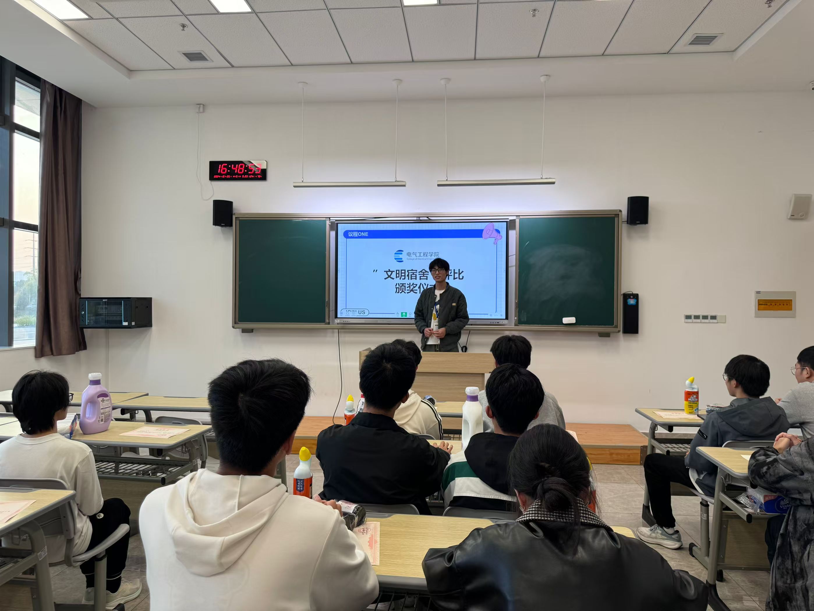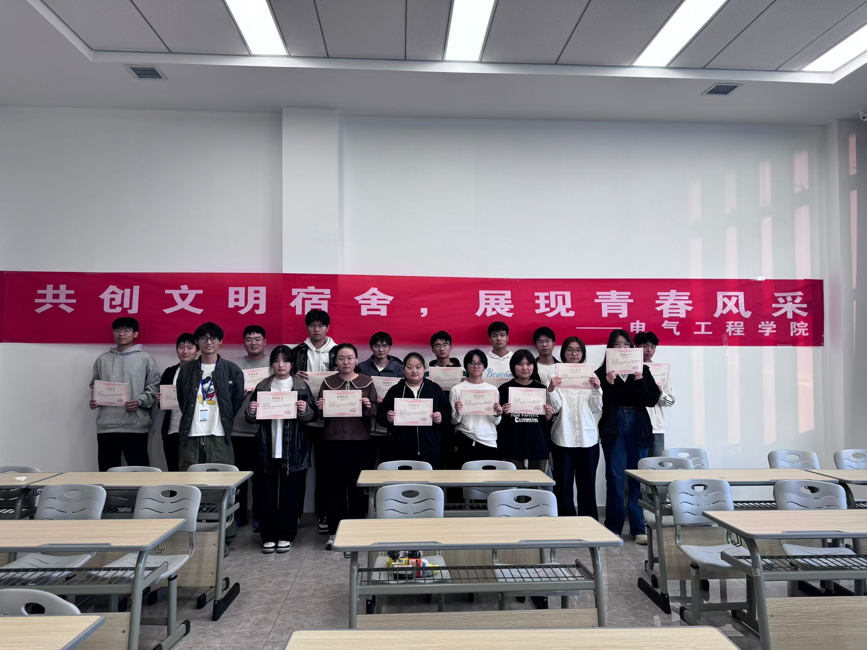 11月17日下午,为嘉奖在文明宿舍评比活动中表现优异的优秀学生宿舍,电气工程学院在溧阳基地举行颁奖仪式。本次活动在思行楼101室进行,公寓辅导员许向东及获奖宿舍长、自律会代表成员参与,活动由自律会代表主持。