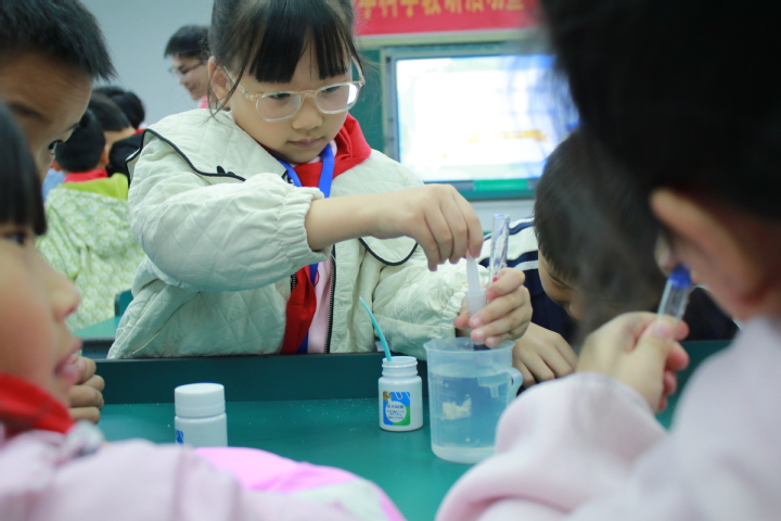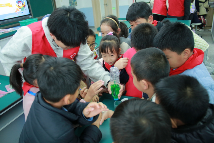 宣讲团成员通过电荷吸引水流、碘钟反应、覆杯实验等物化小实验,向大家一一揭示了各种物理现象背后的科学奥秘,列举了生活中一些常见的物理化学应用,指导大家与同组成员一起再现各种“神奇”的实验现象,走进科学、近距离感受科学,拓展眼界,提高孩子们学习科学知识的兴趣。