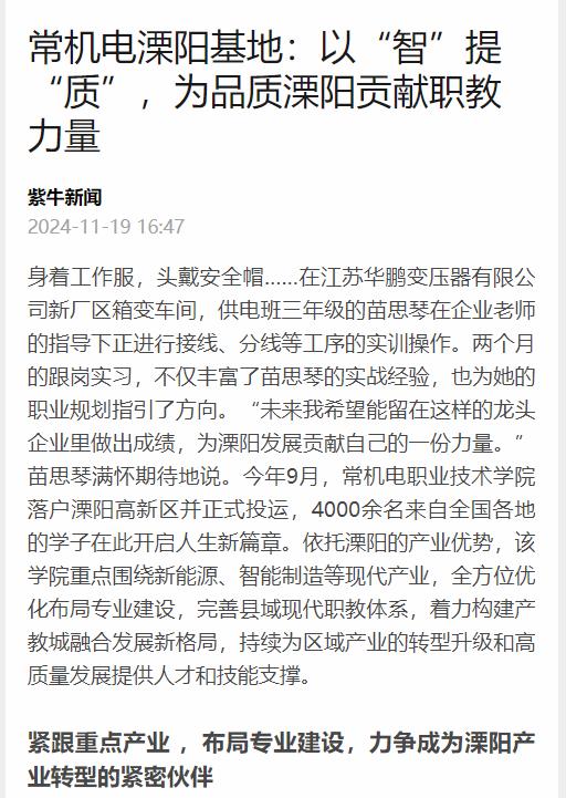 “学生需要实训机会,企业需要专业人才,通过校企合作可以实现‘双赢’。”江苏华鹏变压器有限公司相关负责人认为,常机电以地方资源为依托,与企业探索实行“共建、共享、共赢”的合作模式,开展精准化供需匹配,实现育才因地制宜,在一定程度上满足了企业对高技能人才培养的需求,也能进一步提升企业在聚焦高端,适应产业高质量发展新需求的后备技能人才的培训质量。探索推进产教融合、深化科教融汇的职业教育改革发展新路任重而道远。常机电溧阳校区建设专班相关负责人表示,接下来,高新区和常机电将全力推进扩建升本工程,不断深化产教融合,加强与区域产业的对接与合作,持续优化专业设置和课程体系,以“智”提“质”,为品质溧阳加快发展新质生产力、实现跨越式高质量发展贡献职教力量。通讯员 邹迪 徐怡