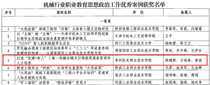 近日,经组织推荐、资格审核、专家遴选等程序,中国机械工业职工思想政治工作研究会对2024年度全国机械行业思想政治工作优秀案例遴选结果予以发布,我校共有5个项目获奖,其中一等奖1项、二等奖3项、三等奖1项。