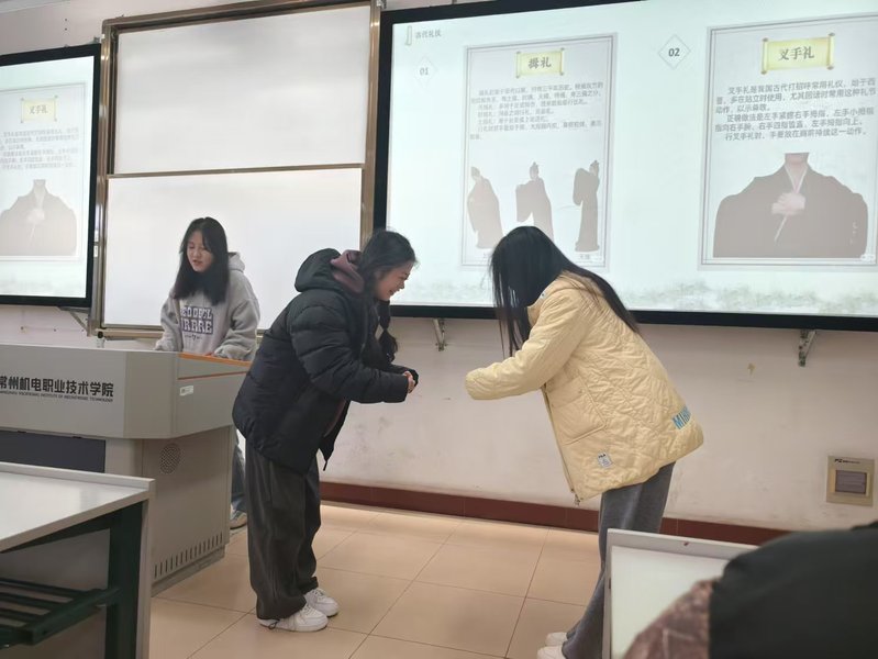 王珂梦从校园生活和未来发展出发,强调了礼仪在课堂互动、社团活动、实习面试等重要场合的关键作用。在讲解中,主持人巧妙地将古代礼仪的韵味、现代礼仪的简洁实用以及中外礼仪的独特之处融合展现,让同学们大开眼界。在礼仪动作的示范环节,许多同学踊跃上台实践,通过拱手、握手和站姿等动作,在实际操作中体会礼仪的规范。