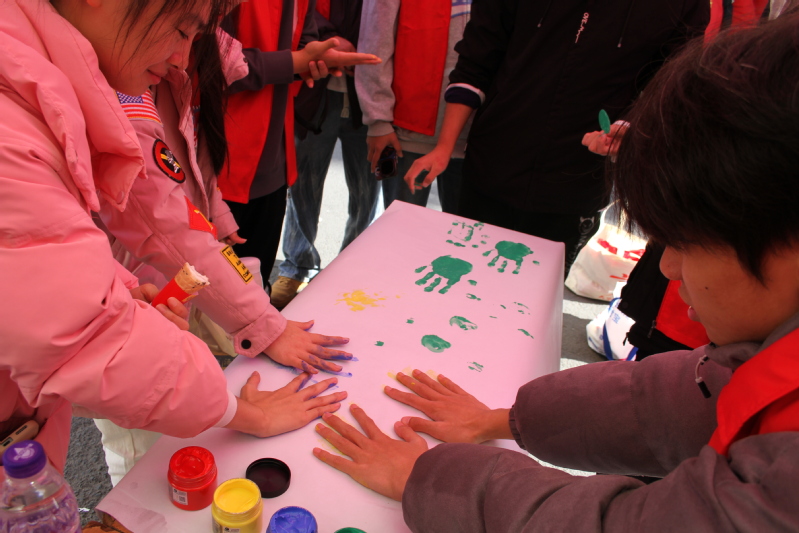 在志愿者活动展示区,志愿者们精心布置,将他们参与过的志愿服务活动的精彩瞬间以照片墙的形式呈现在展板上。他们热情地向同学们讲述自己的志愿者经历,分享助人的幸福和自豪。同学们用颜料涂满双手,在白纸上印下自己的手印,留下独一无二的志愿者印记。