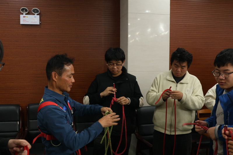 蓝盾救援的教官们演示了心肺复苏和海姆立克急救法的操作步骤,讲解每个动作的要领。同学们积极参与,分组进行实操练习,在教官的指导下,掌握关键急救技能。此外,在绳结教学部分,教官们还展示了“双套结”“平结”“称人结”等多种实用绳结的打法及其应用场景,同学们学习并亲手实践,了解了绳结在户外活动中的重要作用。