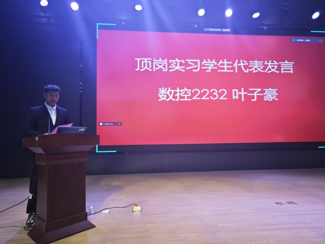 数控2232班叶子豪代表即将顶岗实习的学生作表态发言,表示同学们将坚定信念、扎实行动,全身心投入到顶岗实习中去,不辜负学校期望。