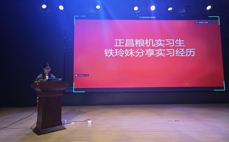正昌粮机实习生机制2232班铁玲妹分享了实习经历,表示认识到了学校所学知识与实际工作的紧密联系,希望大家珍惜实习机会,不断学习,面对挑战。