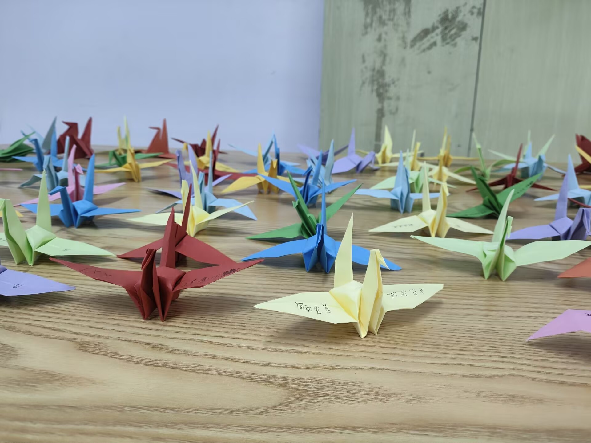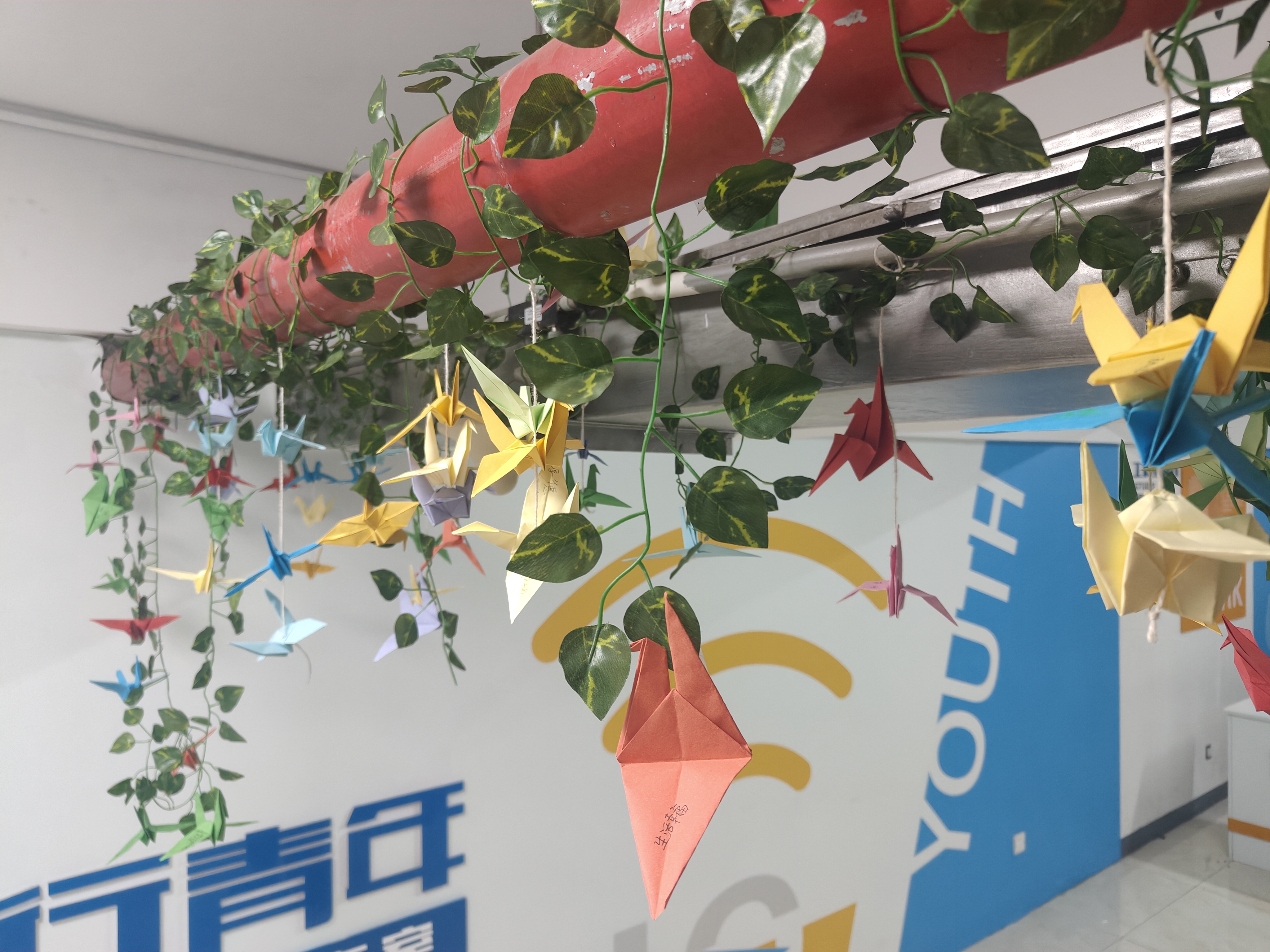 同学们在千纸鹤的翅膀上写下对未来的美好祝愿,并用彩绳将这些承载着心愿的纸鹤串联起来,悬挂在网络文化工作室的墙壁上,为工作室增添了一抹亮丽的色彩。