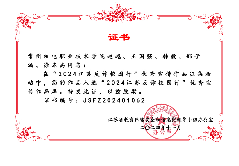 近日,由省网信办主办的“2024江苏反诈校园行”优秀宣传作品征集活动评选结果揭晓。经学校报送,创意设计学院师生创作的微视频作品《五险一金》和海报《画皮2.0》《对网络暴力和隐私窥探说不》成功入选。