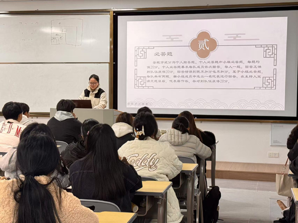 为了营造浓厚的读书氛围,进一步推动书香班级建设,12月10日晚,创意设计学院在溧阳基地巧匠楼406室举行以“书香四溢·智趣横生”为主题的读书知识竞赛活动。