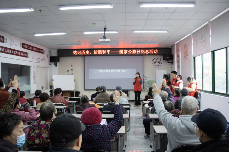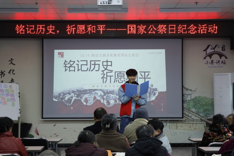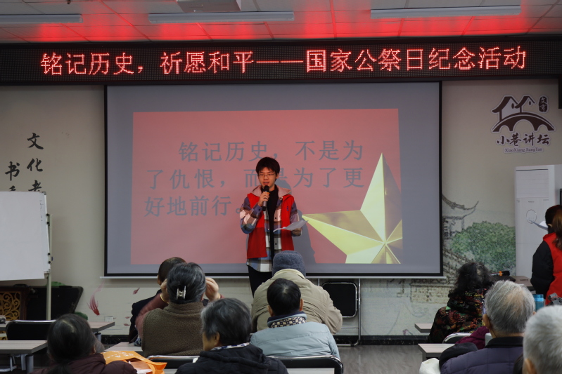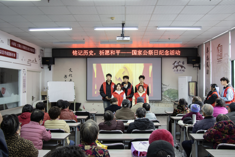 12月12日,机械工程学院的学生们走进文亨花苑社区小巷讲坛,与居民们共同举办了一场以“铭记历史,祈愿和平”为主题的纪念国家公祭日活动,社区居民与青年学子们共上一堂历史课。
