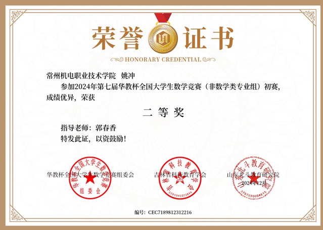 近日,2024年第七届华教杯全国大学生数学竞赛初赛结果揭晓,我校焊接2231班姚冲同学获非数学类专业组初赛二等奖。