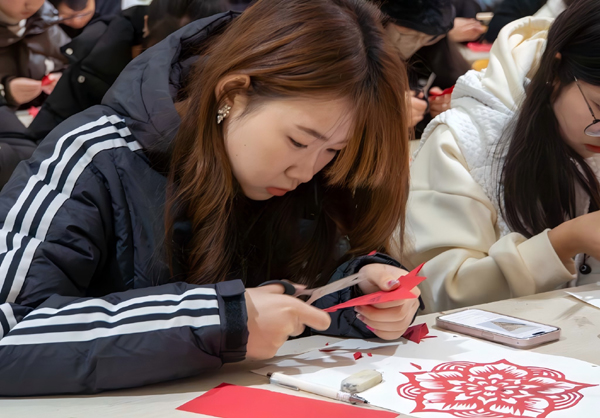 在自主创作环节,同学们纷纷发挥艺术想象力,认真折纸、精心裁剪,一张张普通的纸张在他们的手中逐渐变成了富有创意的剪纸作品。创作过程中,同学们不仅互相展示自己的剪纸作品,交流创作心得,还耐心地为彼此提供指导和帮助,确保每位同学都能充分体验到剪纸艺术的魅力。这种互帮互助的氛围,不仅促进了同学们之间的友谊,也提升了大家的剪纸技艺。