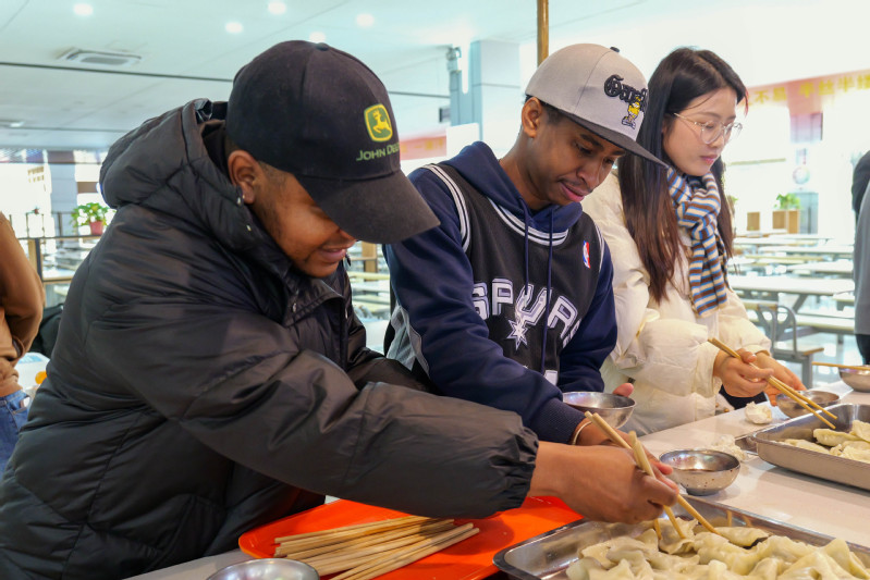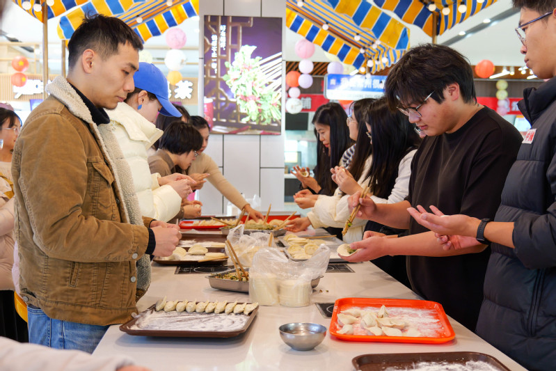 辅导员们有序地分成若干小组,围聚在摆满食材的桌案周围,拿起饺子皮与馅料投入到包饺子的过程中,在不断尝试与交流中逐渐熟练掌握包饺子的巧妙手法与诀窍。