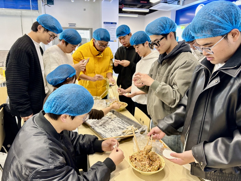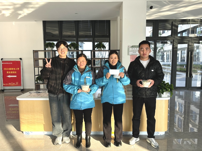 包饺子环节趣味十足,同学们分组围桌,在食堂阿姨的指导下各展身手,捻面皮、填馅料,忙得不亦乐乎。欢声笑语里,饺子摆满盘,情谊也升温了。热气腾腾的饺子出锅后,学院受资助学生将饺子送往宿管阿姨的值班室和门卫大叔的岗亭,小小的饺子承载着感恩与敬意,传递着冬日至暖真情。