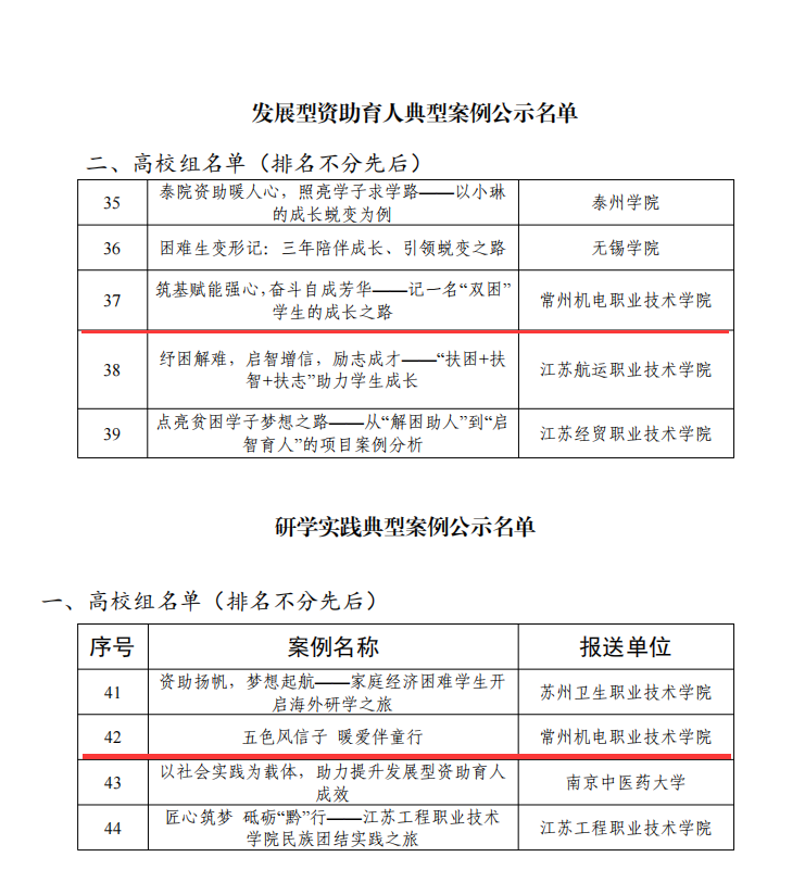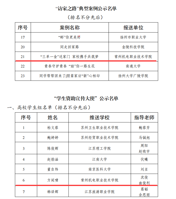 近日,江苏省教育厅公布了2024年“苏乡永助”资助育人主题活动的遴选结果,我校在五大类项目中喜获四项荣誉,分别为发展型资助育人典型案例1项、研学实践典型案例1项、“访家之路”典型案例1项,1名学生荣获“江苏学生资助宣传大使”荣誉称号,所获奖项数量位居江苏省高职院校前列。