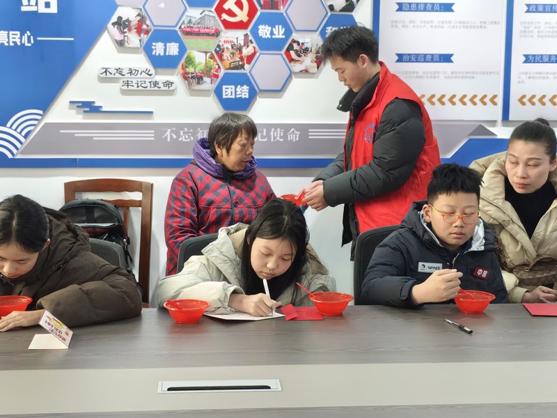 活动现场,猜灯谜吸引了众多居民积极参与,欢声笑语此起彼伏。红色故事宣讲环节中,实践团成员深情讲述革命历史,与居民互动问答,增强了大家的爱国情感。法律小游戏的设计别出心裁,通过趣味问答和情景模拟,将养老助老政策转化为生活场景,让居民们轻松掌握相关政策。最后,实践团成员带领居民们写新春贺卡传递温馨的节日祝福,围坐一起,品尝元宵,交流着各自的生活趣事,共享欢乐时光。