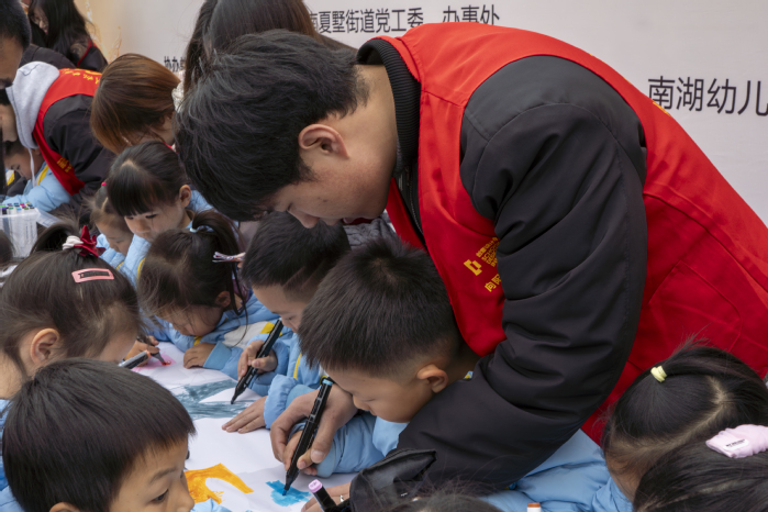 活动在童趣盎然的氛围中拉开序幕,南湖幼儿园小朋友表演的《学习雷锋好榜样》手势舞萌翻全场,青年志愿者们与社区居民共同宣读倡议书,分享新时代雷锋故事。在社区广场中央,“5米雷锋主题涂鸦”成为全场焦点。孩子们在大学生志愿者们的指导下,用笔触描绘出“雷锋叔叔的志愿服务日常”“会微笑的垃圾分类箱”等创意形象,将经典故事转化为简笔画模板,降低儿童创作门槛。涂鸦过程中特别设置“颜色密码”互动环节——绿色代表环保、红色象征助老、蓝色寓意普法,孩子们边涂色边学习公益知识。随着画作完成,志愿者们将长卷悬挂于社区文化长廊,流动的色块与创意形象吸引了众多居民驻足拍照。活动同期还开展了反诈宣传入户行动,志愿者们走进居民家中,用通俗易懂的语言讲解防骗技巧,将安全知识送到百姓家门口。
