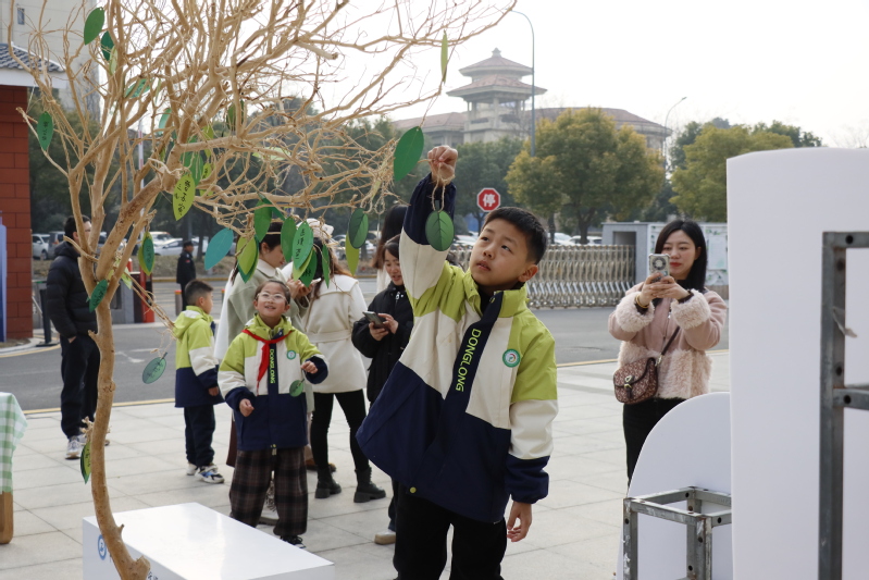 来到东龙实验小学,机械工程学院的志愿者与小朋友们共同完成挖坑、培土、浇水等全流程劳动。过程中,志愿者们借机开启“田间课堂”,孙久祥举起3D打印的树苗铭牌,讲解道:“就像蛋糕师挤奶油,打印机能把塑料丝‘裱’出各种形状。”一(5)班王源小朋友惊叹道:“原来打印机不仅能印纸,还能‘种树’呀!”