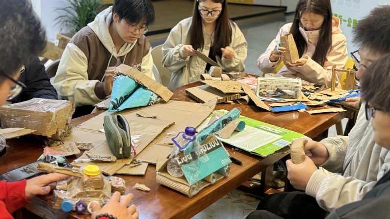 活动以环保劳动+创意实践为主线,设置绿植兑换、叶签寄愿、旧物创艺三大特色环节。在绿植兑换区,同学们用废旧塑料瓶、纸箱、木质边角料等材料兑换多肉盆栽;叶签寄愿环节,同学们在树叶便签上写下对环保的祝愿,为活动增添仪式感,展示了对环保的支持。在旧物创艺环节,同学们在溧阳基地一站式学生社区将回收物品重新利用,通过拼接、改造,制成齿轮、连杆、传动带等“机械风”创意组件,成功“变废为宝”。