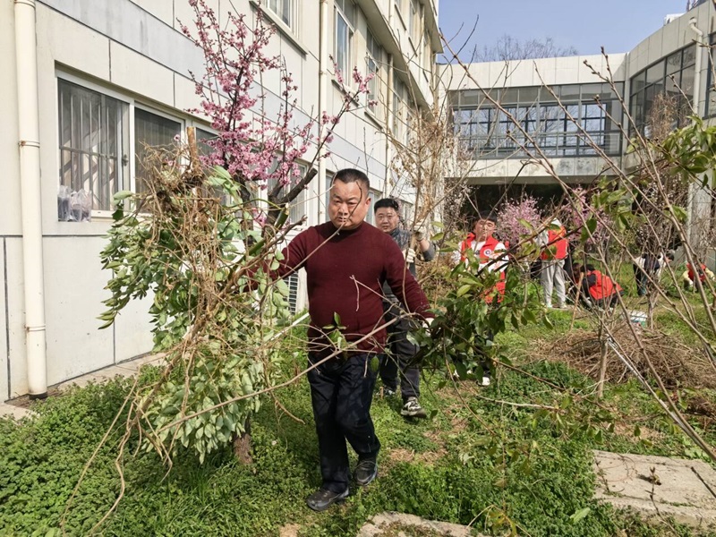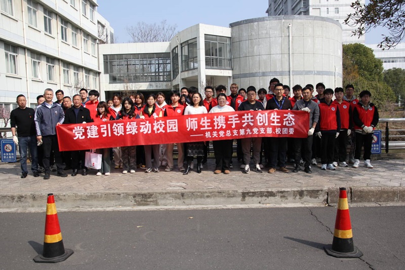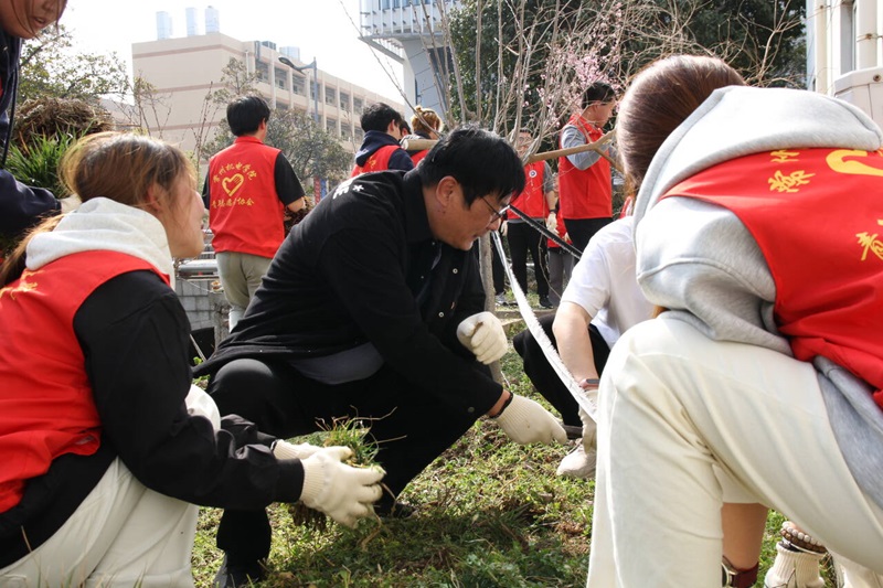 3月11日下午,机关党总支第九党支部、团委青年志愿者在樱花园开展了 “党建引领绿动校园,师生携手共创生态”的校园爱绿护绿主题党日活动。
