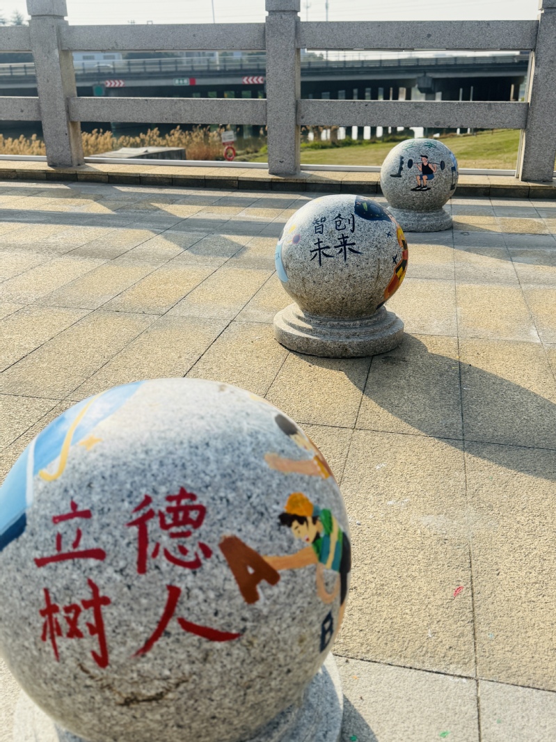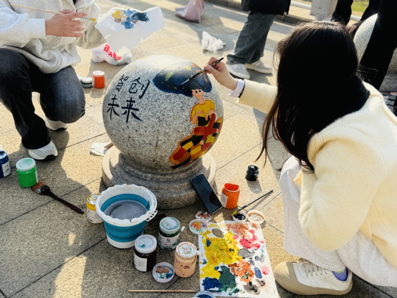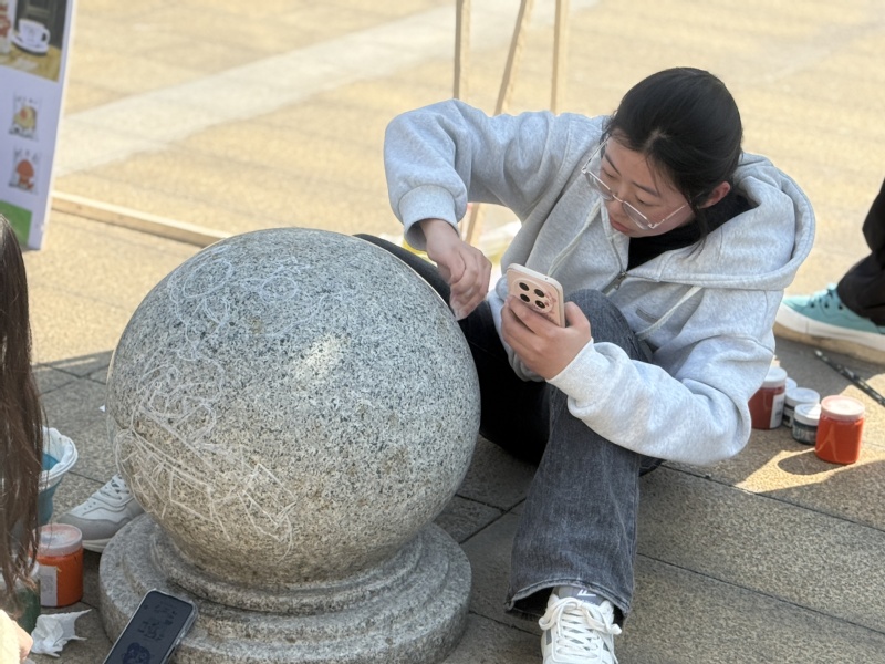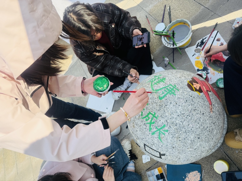 活动现场,20余名艺术专业学生化身校园美容师,手持画笔、调色盘,在指导老师带领下对教学楼前的石墩进行创意改造。同学们结合专业所学,将立德树人,全面发展、传承文化,智创未来、健康生活,快乐成长等内容融入设计,通过丙烯颜料层层晕染,原本灰暗的石墩逐渐呈现出斑斓色彩。艺术设计专业的朱同学说:“我们反复推敲构图比例,既要考虑视觉效果,又要保证颜料附着性,每个细节都凝聚着团队智慧。”经过精心创作,传承文化、推陈出新的“创新石墩”,强身健体、修身养性的“健身石墩”,刻苦学习、全面发展的“学霸石墩”亮相校园,成为同学们的新晋打卡点。