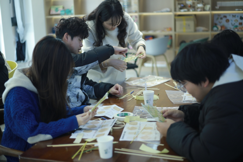 手工实践环节,学生们拿起工具和材料,动手尝试制作竹编风铃。尽管初始时手法生疏,但在老师的耐心指导下,学生们逐步掌握了编织技巧。他们专注地穿梭竹篾,精心调整每一处细节,领悟传统工艺对精准度与美感的极致追求,体会传统手艺人对作品倾注的工匠精神。