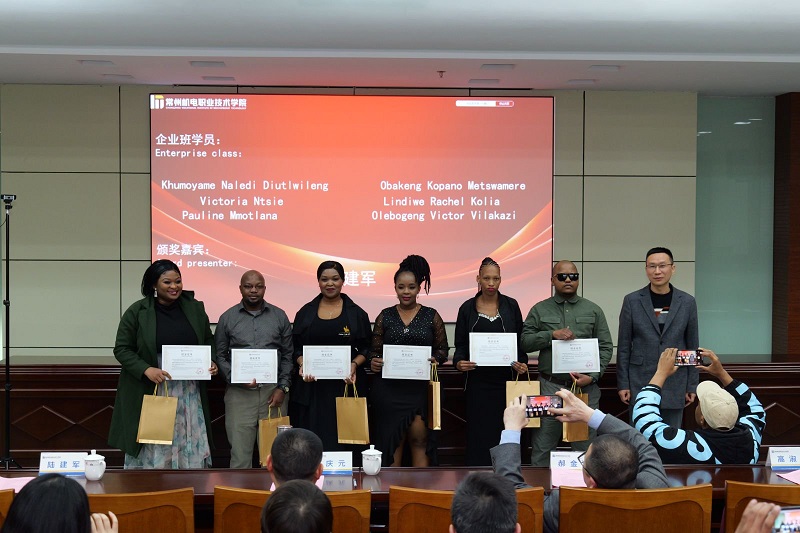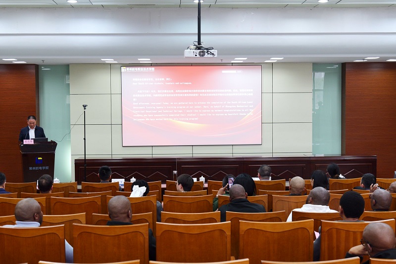 3月28日下午,国际市域政产教联合体合作项目(中国-南非)结业典礼在我校图书馆紫厅举行。南非地方政府培训署领导,常州飞翔进出口贸易有限公司总经理,我校副校长周庆元,相关部门负责人和全体培训班学员参加了典礼。
