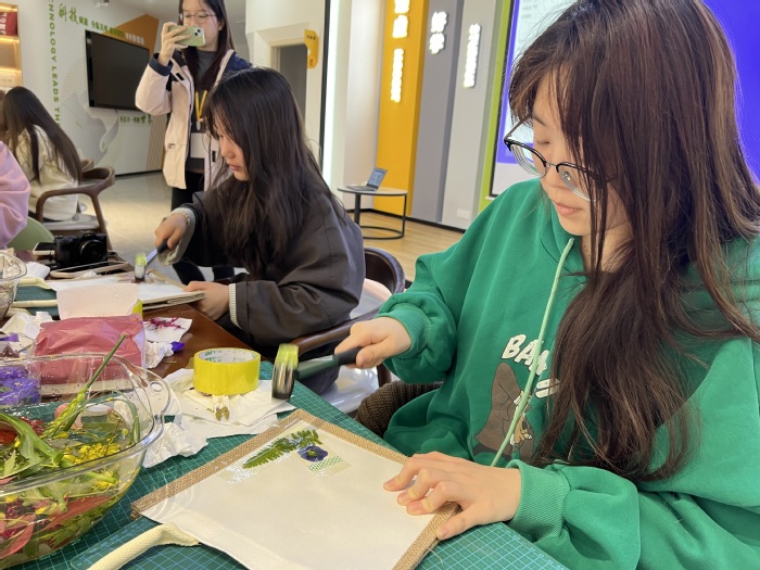 4月1日上午,创意设计学院在溧阳基地一站式学生社区开展捶草印花植物拓染体验活动。学生在敲打草木的韵律中感受传统手工艺的智慧,将春日草木的纹理与色彩定格于帆布包,创作出20余件独特作品。