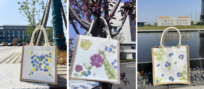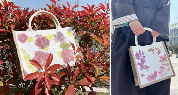 同学们在校内外采集蕨类、红叶女贞、油菜花、金缕梅、角堇等纹理鲜明或色彩鲜艳的植物,通过“采-洗-浸-吸-固-捶-晾”,在帆布包上创作出一幅幅自然画卷。随着锤子富有节奏的敲击,花瓣叶脉的轮廓渐次浮现,植物汁液与棉布纤维产生奇妙的显色反应。