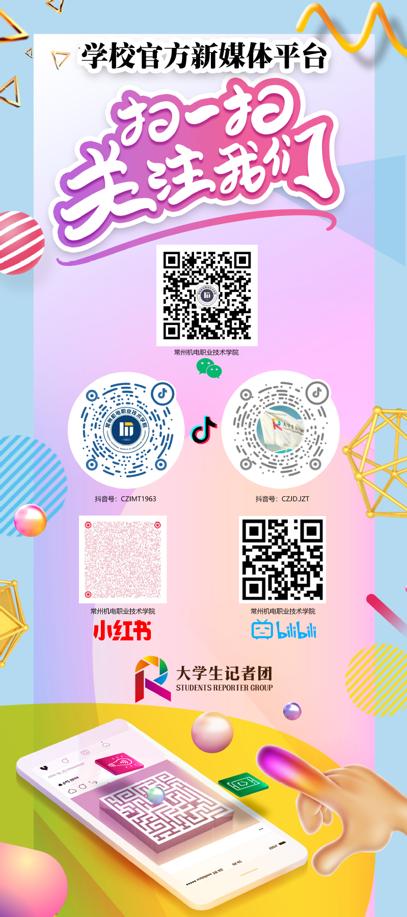 为加强校园新媒体平台建设,提升学校融媒体矩阵的影响力,3月26日,我校在丰登楼一楼举办“融聚校园声音 传递机电风采”融媒体矩阵推广活动。本次活动是学校“网络素养训练营”系列活动之一,由党委宣传部主办、大学生记者团协办,旨在引导师生关注学校官方新媒体平台,进一步扩大校园文化的传播力和覆盖面。