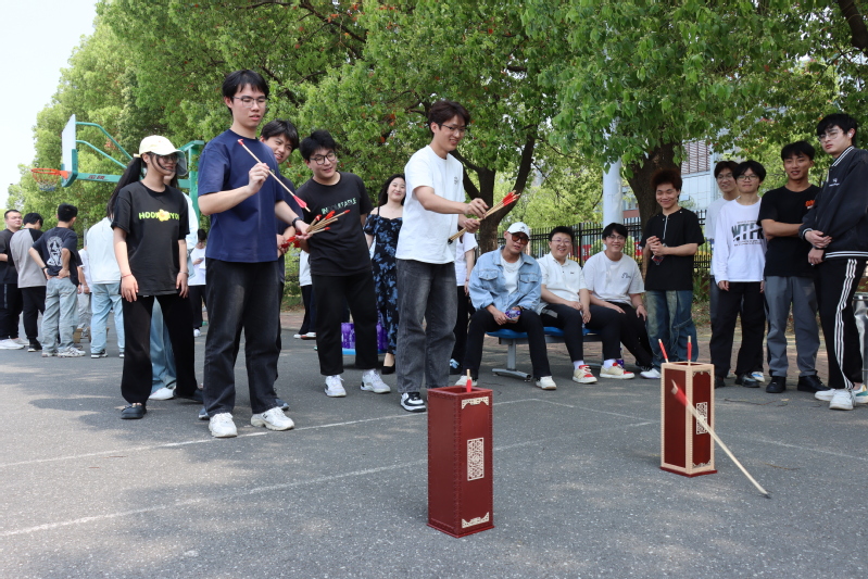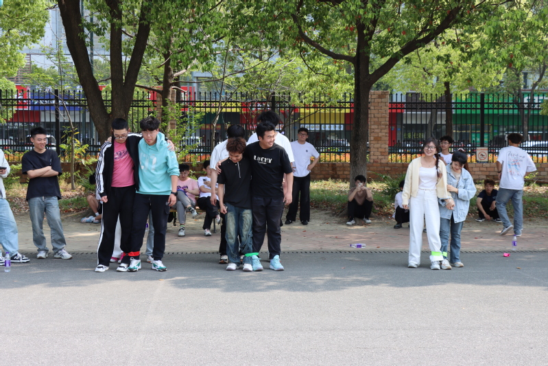 运动会设置投壶、竹筐接沙包、两人三足三大趣味项目,将传统劳动智慧与现代团队挑战巧妙结合。投壶区,选手们手持木箭屏息投掷,箭矢入壶的清脆声响与欢呼声此起彼伏;竹筐接沙包区,2人小组展开激烈协作,投手精准抛投、接筐者腾挪辗转,每一次配合都充满紧张与默契;两人三足接力赛中,4人团队绑腿竞速,“一二、一二”的口号响彻赛场,即便绑带脱落,队员们也能迅速重振旗鼓,展现出“永不言弃”的团队精神。本次活动采用跨班级组队形式,鼓励学生打破班级界限,自由组建团队。赛场上,不同班级的同学相互配合,默契协作。