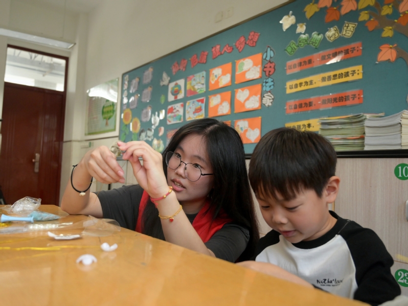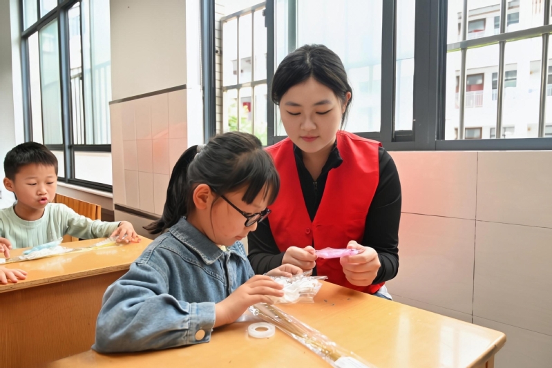 随后,志愿者们与同学们共同开启手工DIY环节。在志愿者指导下,孩子们拿起彩纸、剪刀和胶棒,开始制作立体纸艺花朵。折花瓣、卷花茎、贴装饰,每一步都专注投入。“老师你看,这朵粉色的要送给妈妈,她最喜欢粉色!”“我要把花藏进书包,给妈妈一个惊喜!”现场欢声笑语不断,志愿者们穿梭其间,或手把手指导技巧,或帮孩子录制感恩视频。志愿者们耐心地指导小学生掌握操作的细节,而小学生则以他们的创造力回馈于手工设计,形成了一个跨学段的、温馨融洽的协作氛围。