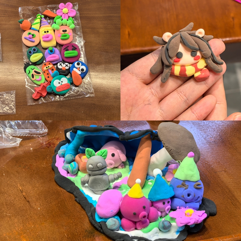 在创作环节中,同学们用黏土发挥自己的想象力,有的同学专注于制作可爱的小动物,将黏土巧妙地组合成小章鱼、小螃蟹、小蜜蜂等形象;有的用彩色黏土为卡通人物点缀上明亮的眼睛、俏皮的嘴巴。活动现场气氛热烈而有序,同学们沉浸在黏土的奇妙世界中,相互交流、分享创意,不时传来阵阵欢声笑语。