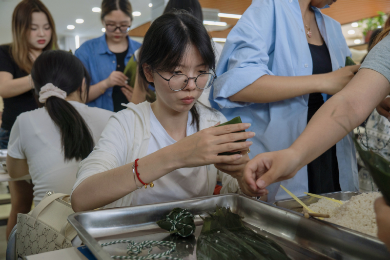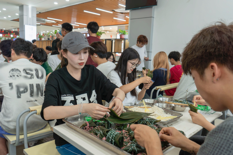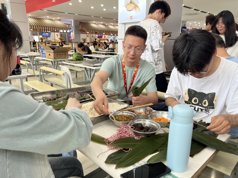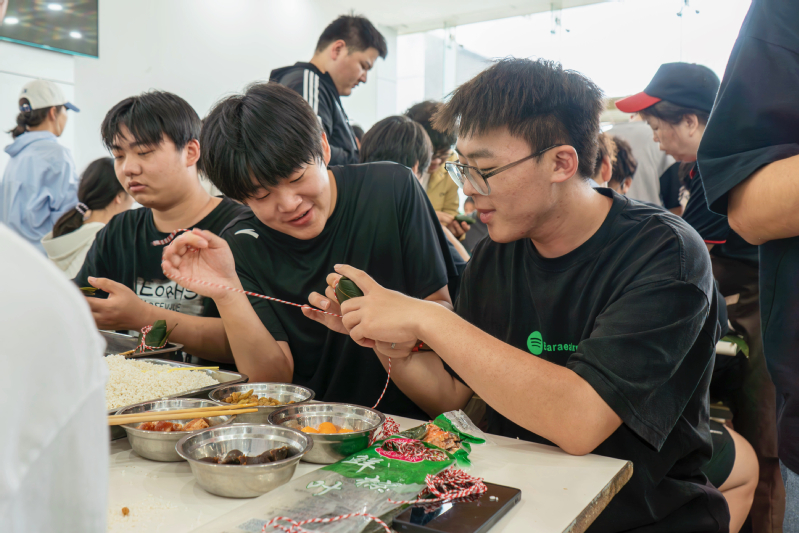 包粽子环节,模具技术学院学生凭借专业技能,优化包粽步骤,设计高效协作模式;创意设计学院学生发挥创意,将粽子改良成多样造型,加入彩线编织等元素,让粽子充满童趣。