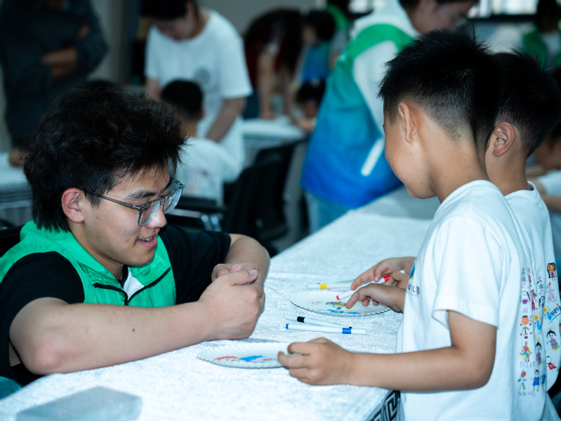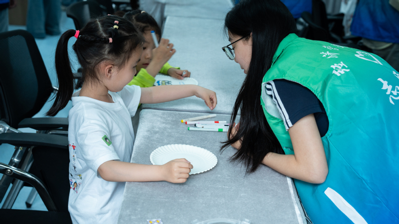 在绘画环节,孩子们以端午节为主题,发挥奇思妙想,用多彩的画笔在纸盘上描绘出了充满想象力的作品。孩子们还现场投票选出了“最有趣作品”,收获了成功的自豪和喜悦。最后,志愿者和孩子们一起唱着《再见歌》击掌告别。