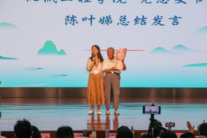 陈叶娣作总结讲话。她肯定了此次活动在文化传承与匠心培育中的创新实践,并用“三个感谢,两个感动”情真意切地表达了对活动背后各方付出的诚挚谢意与内心触动。陈叶娣代表学校向退休老教师陈维新送花,表示着传统文化与匠心精神在代际之间的传承与延续。
