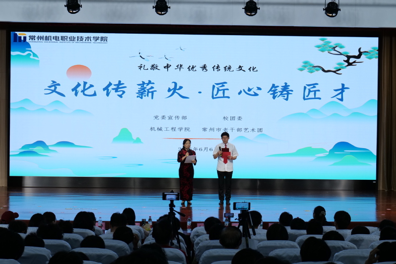 6月6日,我校开展“文化传薪火・匠心铸匠才”传统文化进校园活动。此次活动由党委宣传部、校团委、机械工程学院和常州市老干部艺术团共同举办。副校长刘贤锋、党委宣传部部长毛加明、学院党总支书记陈叶娣、全国劳动模范刘小莺、退休老教师陈维新与我校400余名师生共同参加了此次活动。