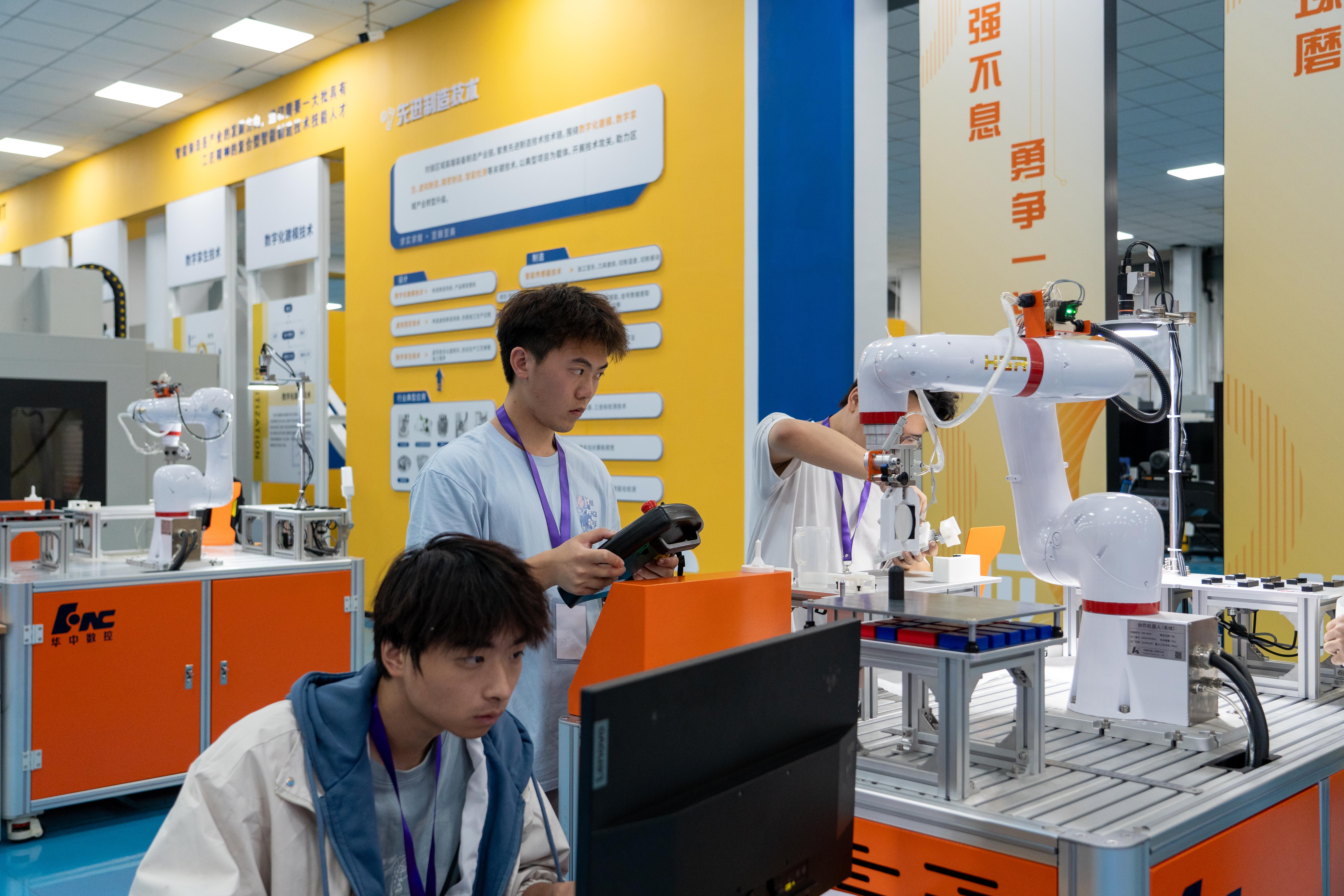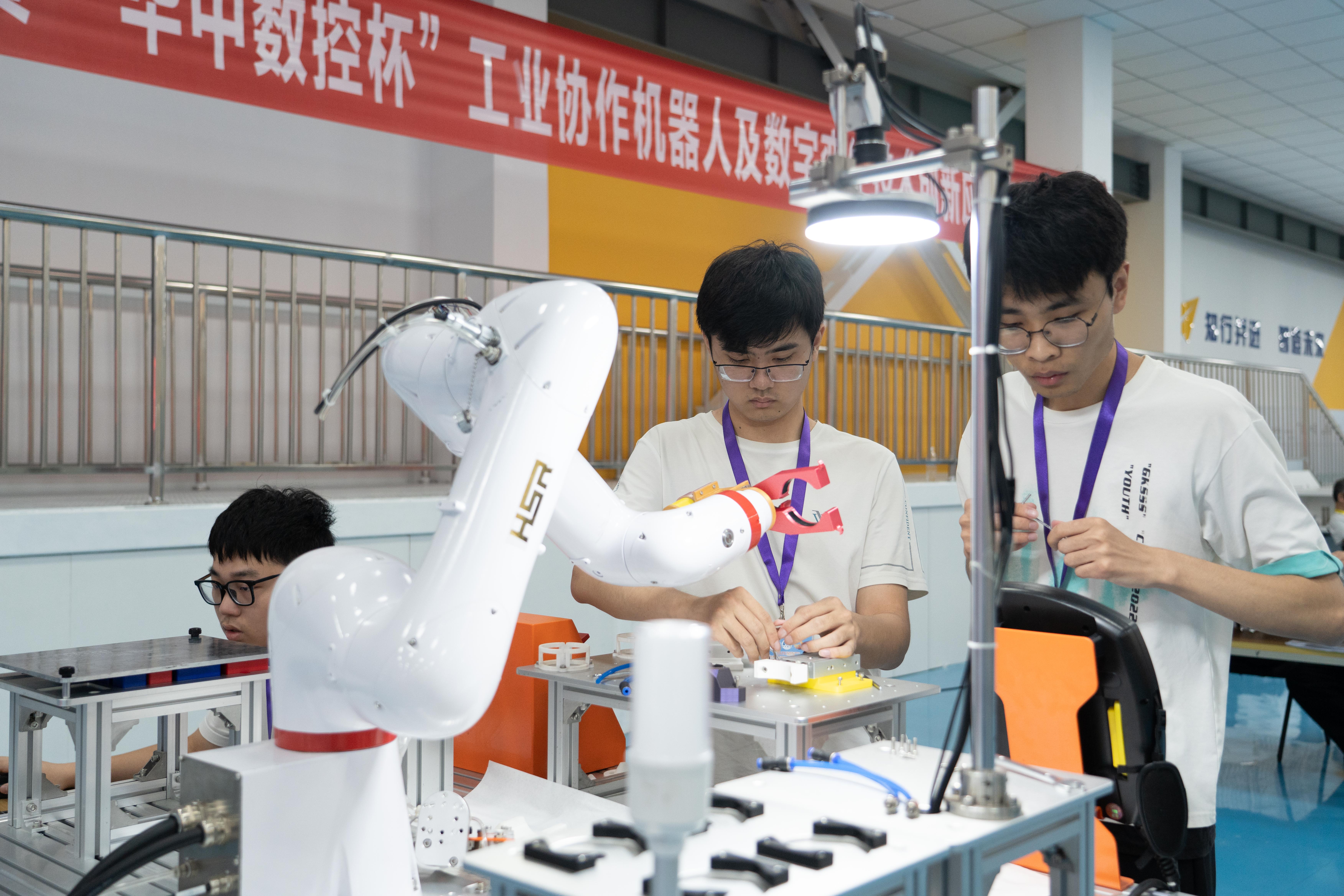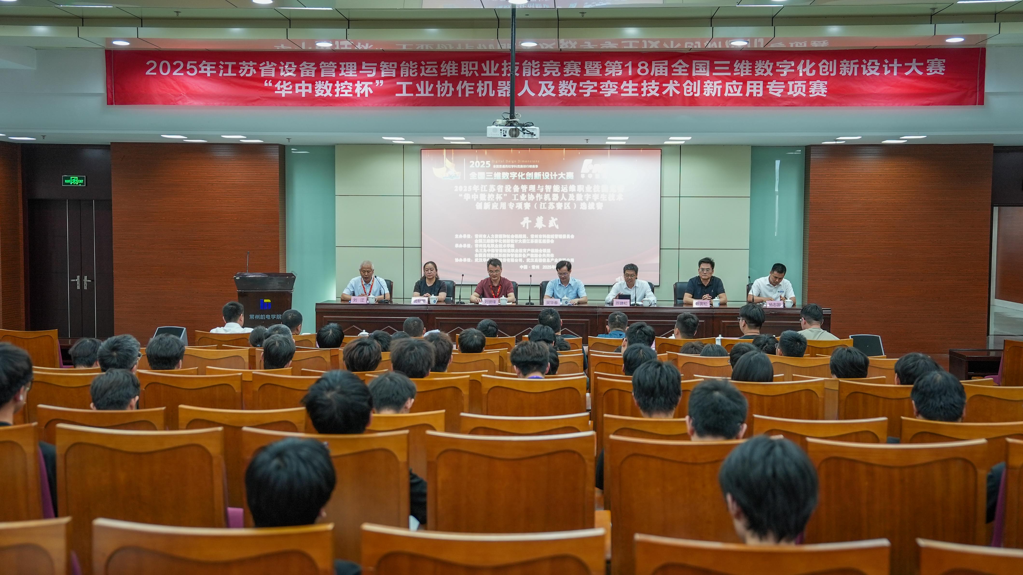 大赛由常州市人力资源和社会保障局、常州市科教城管理委员会、全国三维数字化创新设计大赛组委会主办,我校与长三角中德智能制造职业教育产教融合联盟、全国高档数控系统和智能装备产教融合共同体共同承办,武汉华中数控股份有限公司、武汉高德信息产业有限公司提供技术支持。来自全省13个学校和企业的27支队伍、70名选手齐聚常机电,围绕工业协作机器人与数字孪生技术展开竞技。