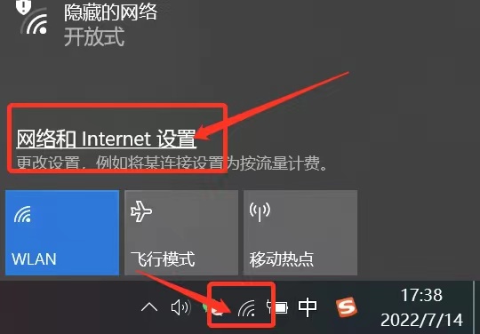 点击电脑右下角网络图标--网络和internet设置--以太网--更改适配器选项--找到无线网卡,鼠标右击先禁用,过一分钟再启用无线网卡。